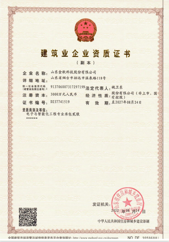¿ËÈÕ£¬¾É½¶«Ê¡×¡·¿ºÍ³ÇÏ罨ÉèÌüÅú×¼£¬É½¶«½ðÈí¿Æ¼¼¹É·ÝÓÐÏÞ¹«Ë¾Ë³ËìÈ¡µÃ¡°µç×ÓÓëÖÇÄÜ»¯Ê©¹¤·¡¼¶×ÊÖÊ¡±£¬´Ë